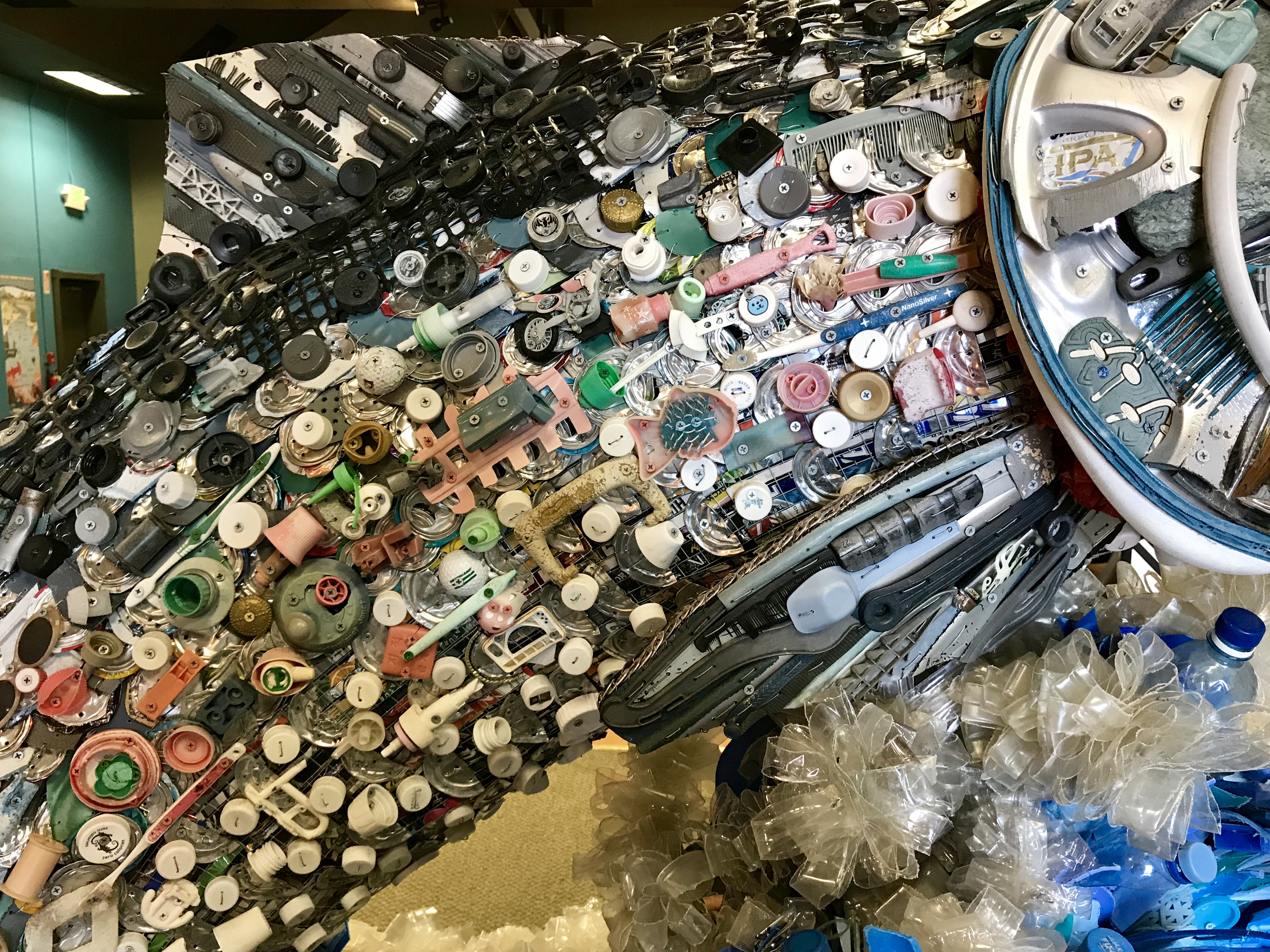 From a volunteer docent, we learned that the Washed Ashore Project builds and exhibits these powerful pieces to graphically illustrate the tragedy of plastic pollution in our oceans and waterways, in the hope of sparking positive changes in consumer habits. The organization collects trash that community volunteers remove from beaches. After they wash and sort it, a professional artist designs a sculpture and directs a group of Washed Ashore team members, volunteers and students in building it.